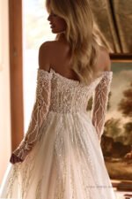 Accents: A-line dress with long sleeves. The off-shoulder corset is decorated with beads, pearls, sequins, and lace embroidery. The exposed shoulders emphasize the bride’s delicate beauty and add a romantic touch to the look;