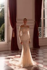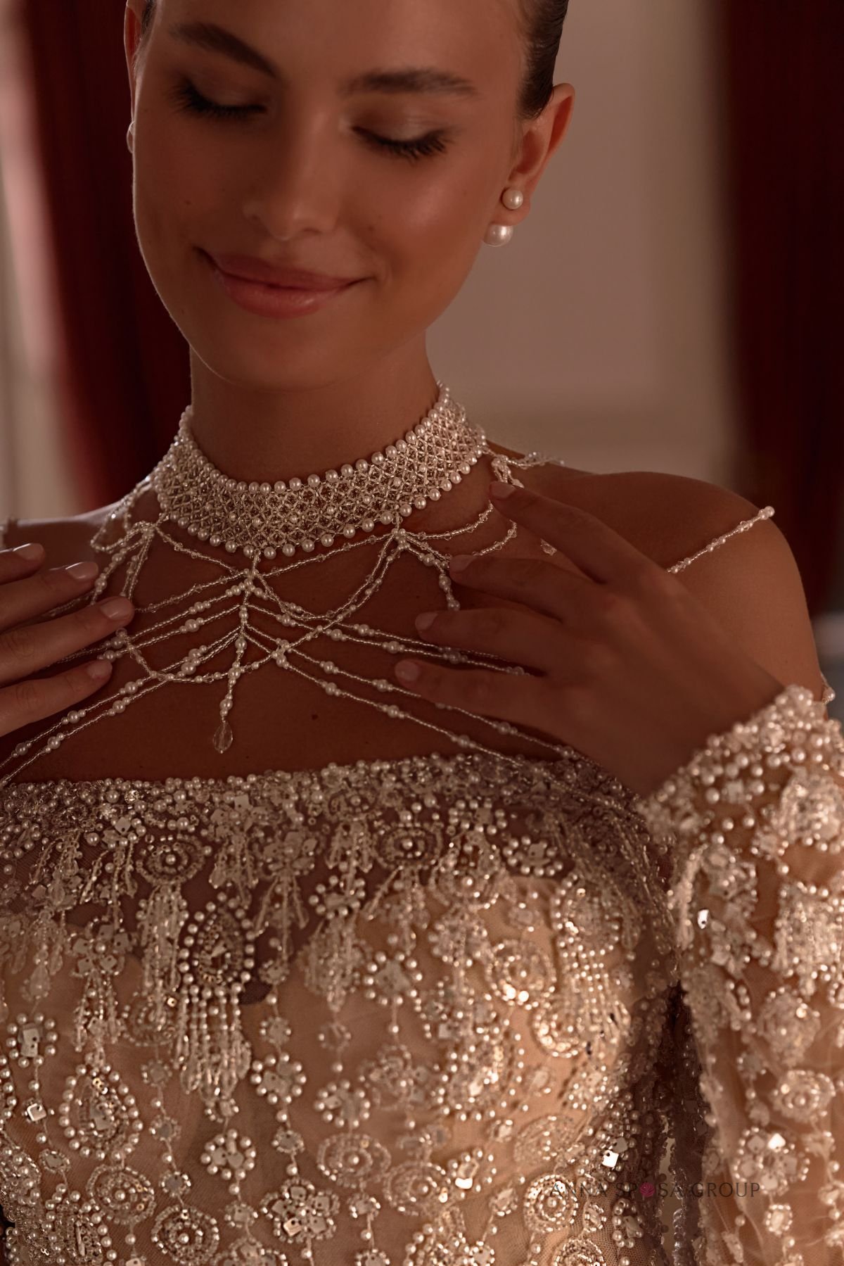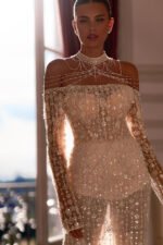 Accents: a luxurious translucent fitted dress with long sleeves. The dress is decorated with beads, sequins and pearls. The neck and shoulder jewellery adds a special touch to the look.