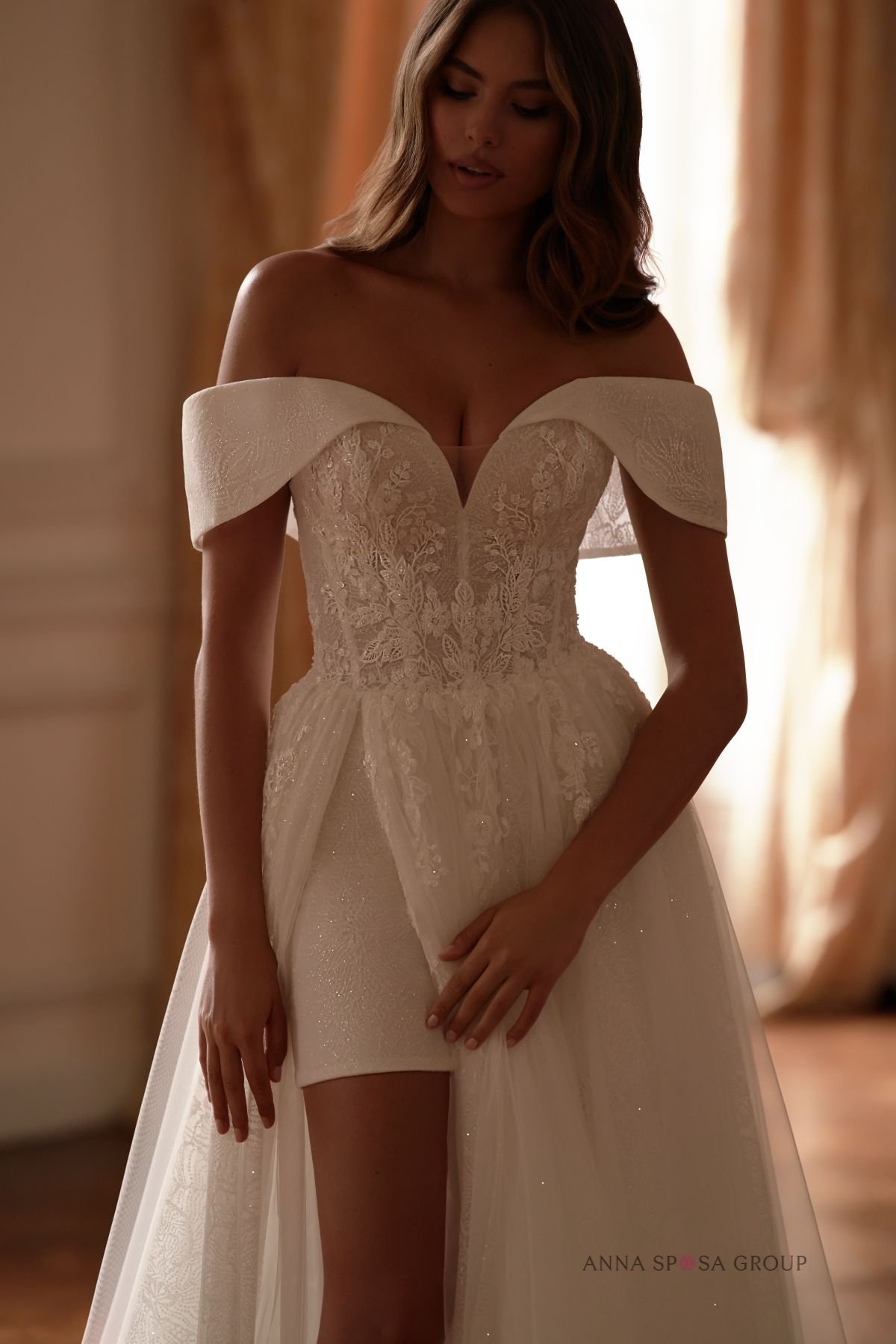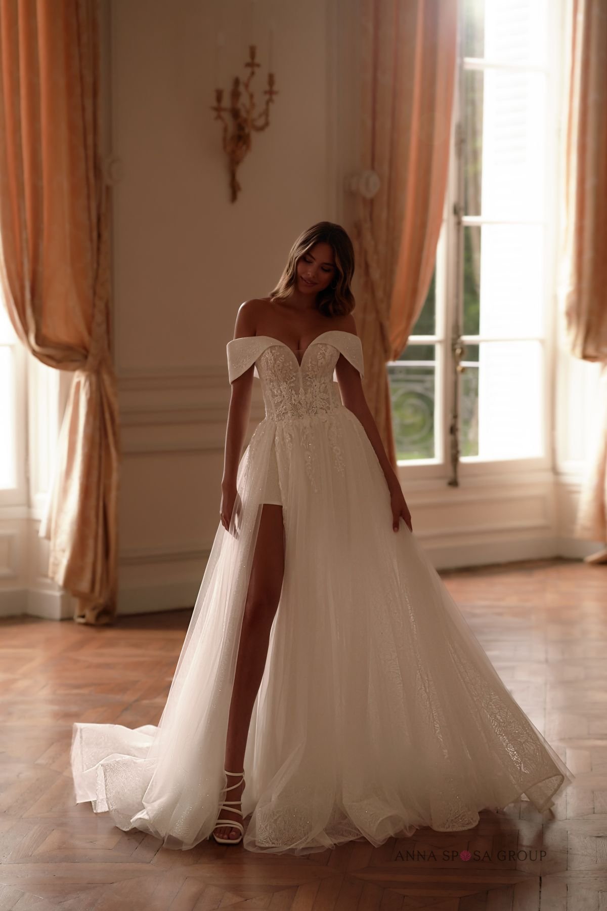 Accents: a luxurious lush gown with off-shoulder collar. The dress is decorated with floral lace, beads, and sequins. The shimmering fabric coating adds even more shine. The high slit on the skirt makes the look very seductive and spectacular.
