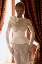 Accents: a striking fitted gown with long sleeves. Made of delicate beaded lace embroidered with sequins, the dress features a detachable basque waist corset that highlights the waistline. The removable decorative flower and short gloves complete the look, adding a touch of extra charm and impact;