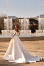 Accents: a luxurious lush gown with off-shoulder straps. The corset features elegant draping that highlights the waist and neckline. The top layer of the skirt is adorned with floral lace, beads, sequins, and hand-crafted 3D floral appliqués. The off-shoulder straps add a playful, feminine touch to the look;