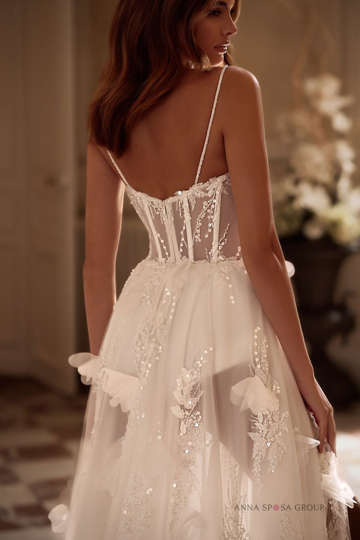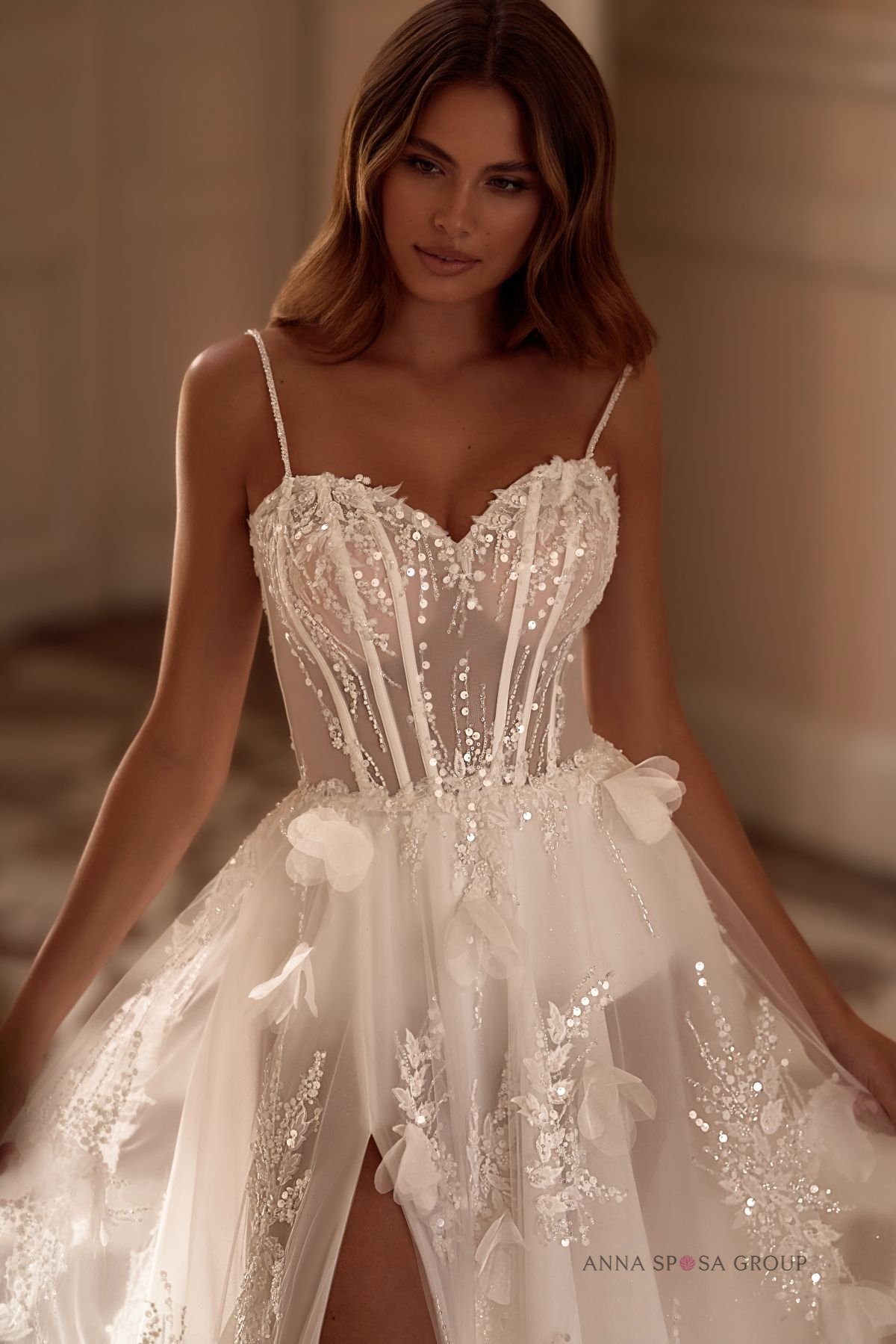 Accents: a romantic A-line dress with thin straps. The semi-transparent dress is decorated with beads and sequins, floral lace and voluminous handmade floral applications. The deep neckline and high spacer on the skirt make the look even more feminine and seductive.