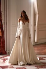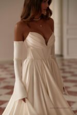 Accents: a luxurious classic A-line dress with long detachable sleeves. The dress has a minimalist décor, with an original cut – an accentuated neckline with a translucent mesh insert. The skirt with a long spectacular train and a slit on the side adds a touch of glamour and femininity to the look.