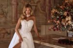 Accents: a striking strapless A-line gown. The corset is made of delicate, original lace and embellished with beads and pearls. The lightweight, multi-layered skirt adds softness and an airy feel to the look;