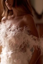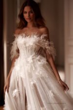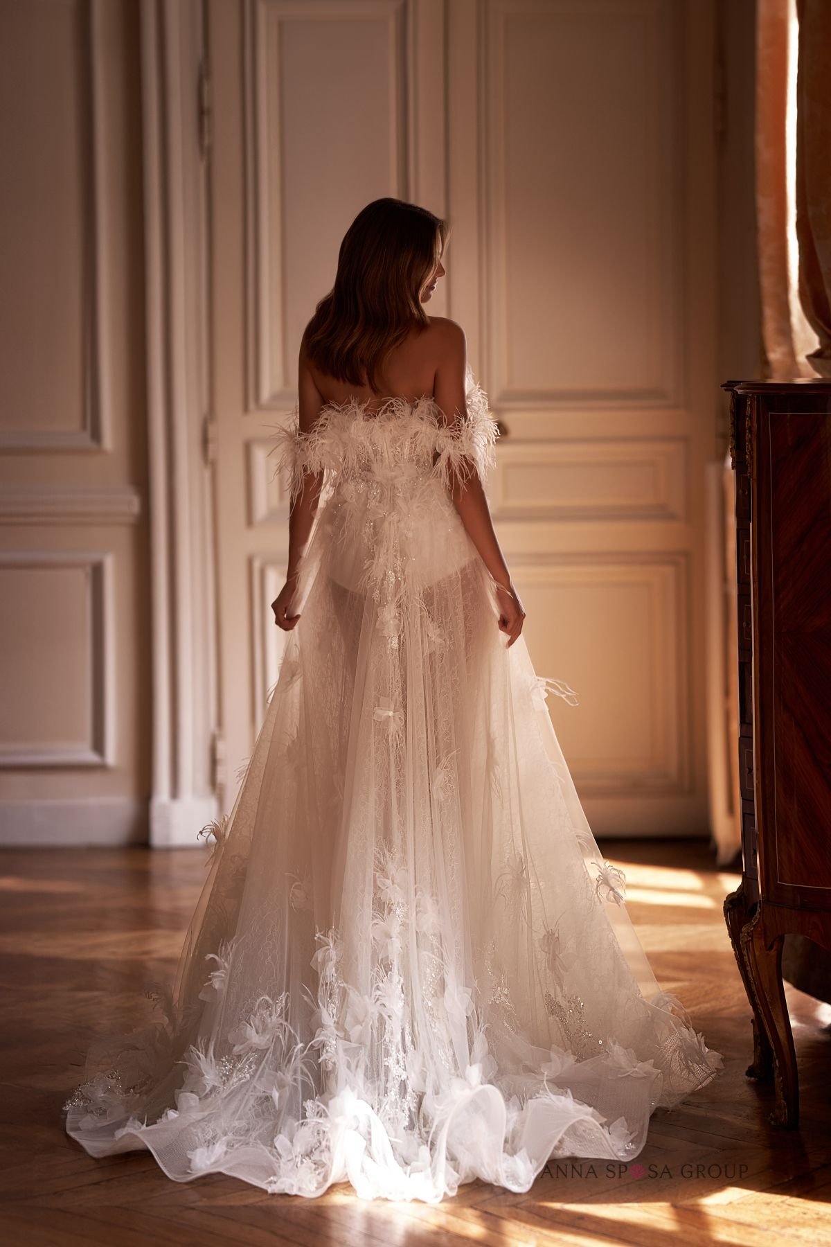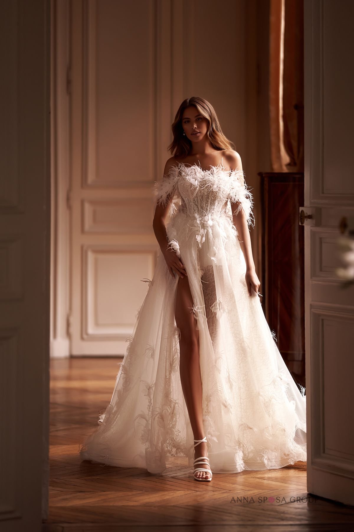 Accents: a romantic A-line dress with off-shoulderstraps. The corset is decorated with lace, beads and sequins. The skirt is made of light translucent fabric. There are voluminous handmade floral appliques and feathers, which makes the look even more feminine and dreamy.