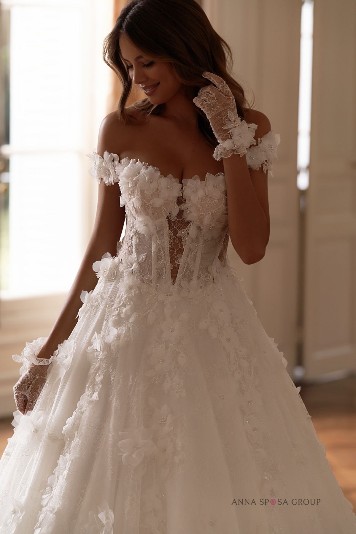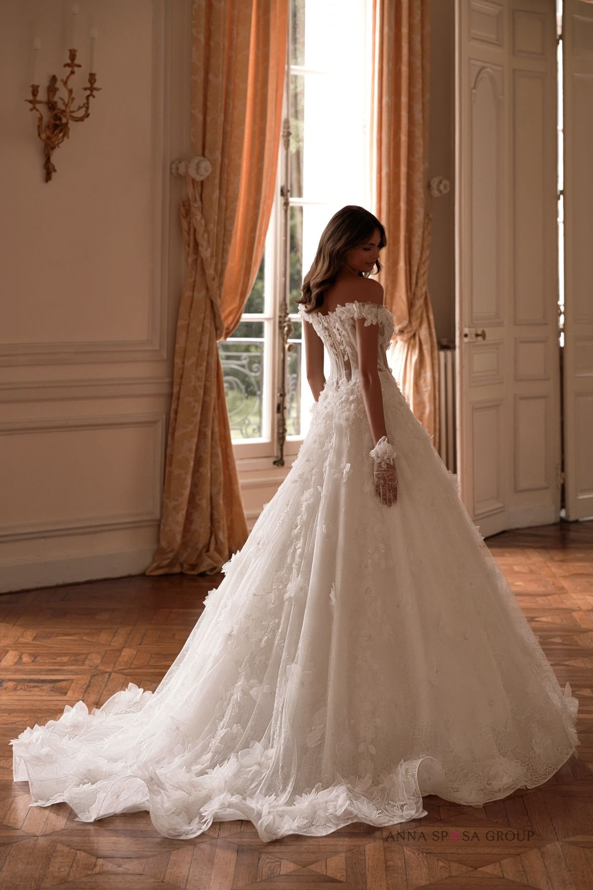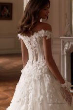 Accents: a spectacular lush dress with off-shoulder straps. It is decorated with floral lace, voluminous floral appliques, beads and sequins. Exposed shoulders and collarbones make the look even more feminine and emphasise the bride’s fragility, while off-shoulder straps and lace short gloves add playfulness to the look.