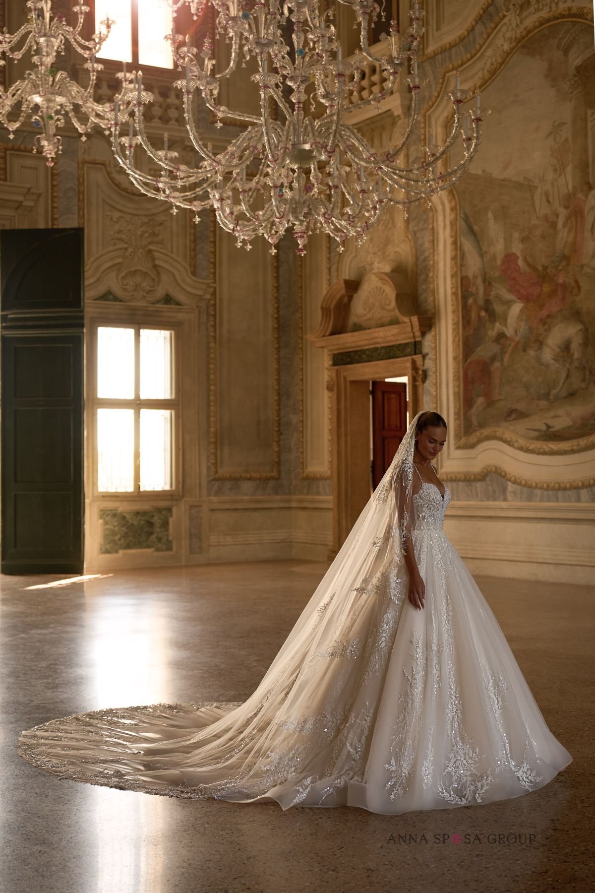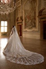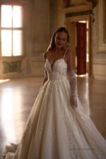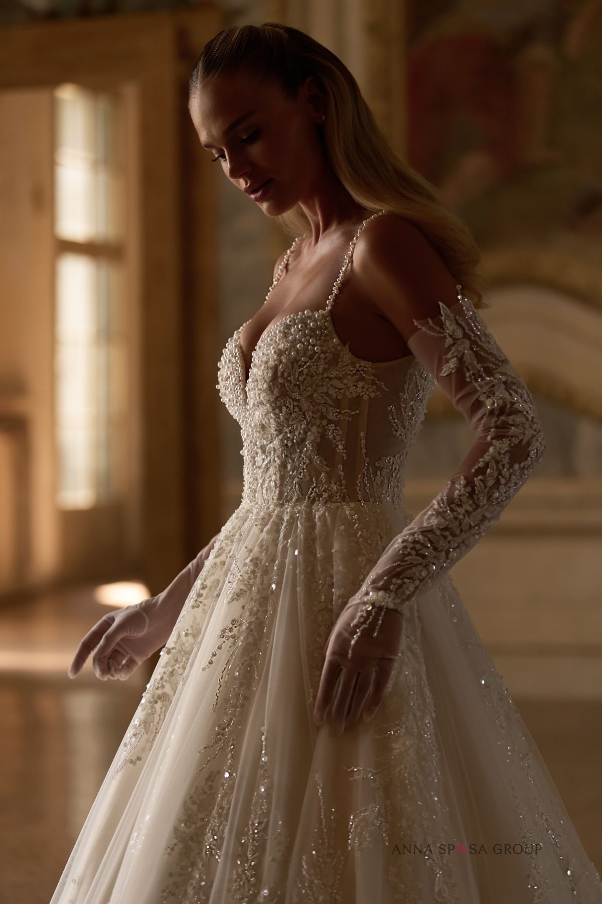 Accents: a spectacular lush dress with thin straps. It is decorated with original lace, beads, sequins and pearls. There are deep V-shaped cutouts on the neckline and back, which add seductiveness to the look. Long detachable gloves, veil, and train make it even more luxurious.
