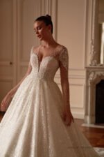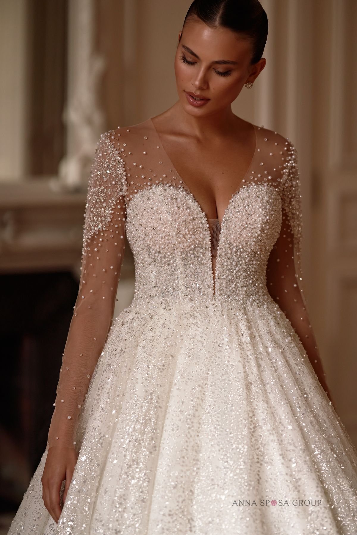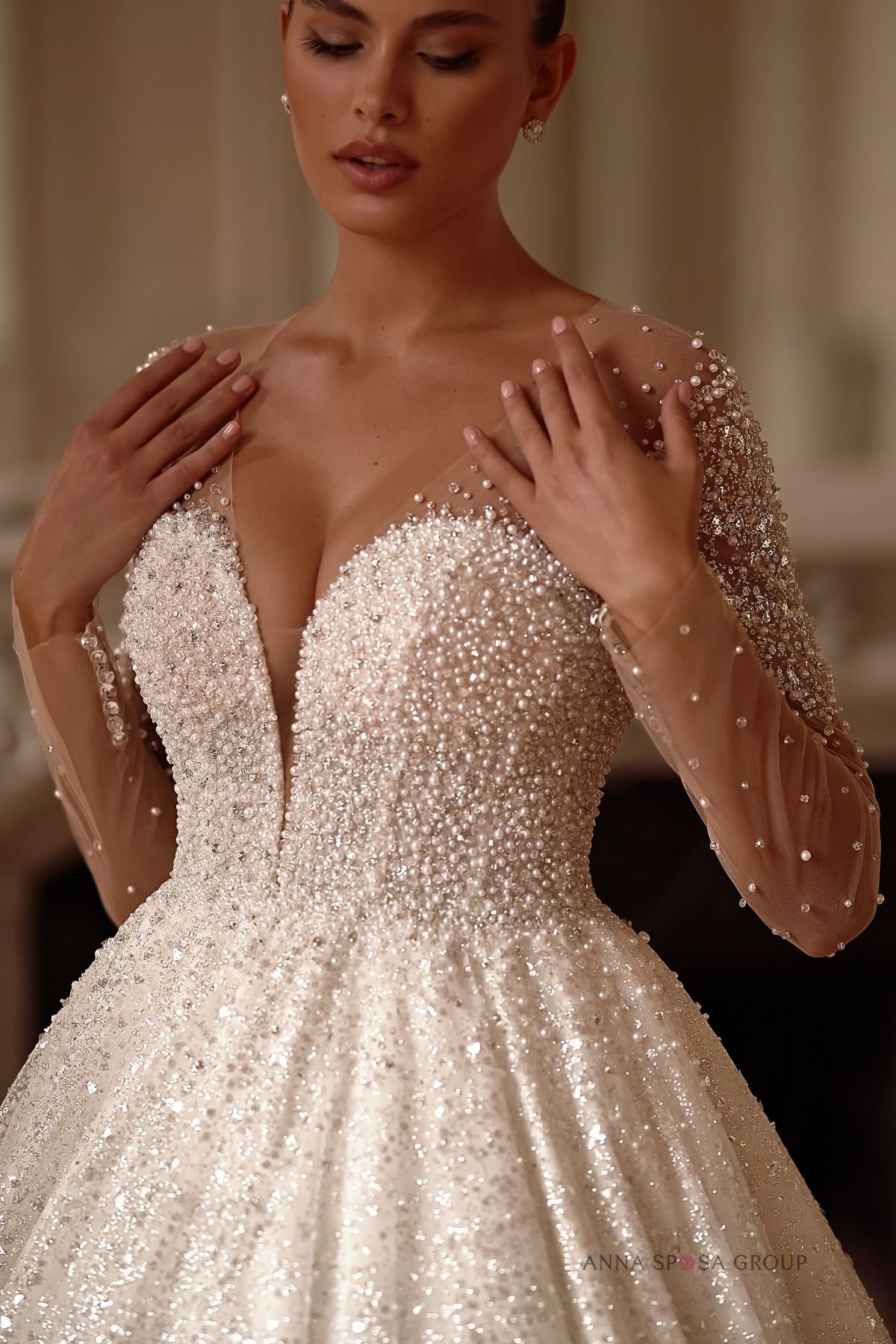 Accents: a luxurious lush dress with long sleeves. It is decorated with beads, sequins, and pearls. There is also a deep V-neckline with a translucent mesh insert. A long spectacular train makes the look even more impressive.