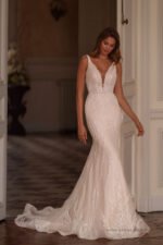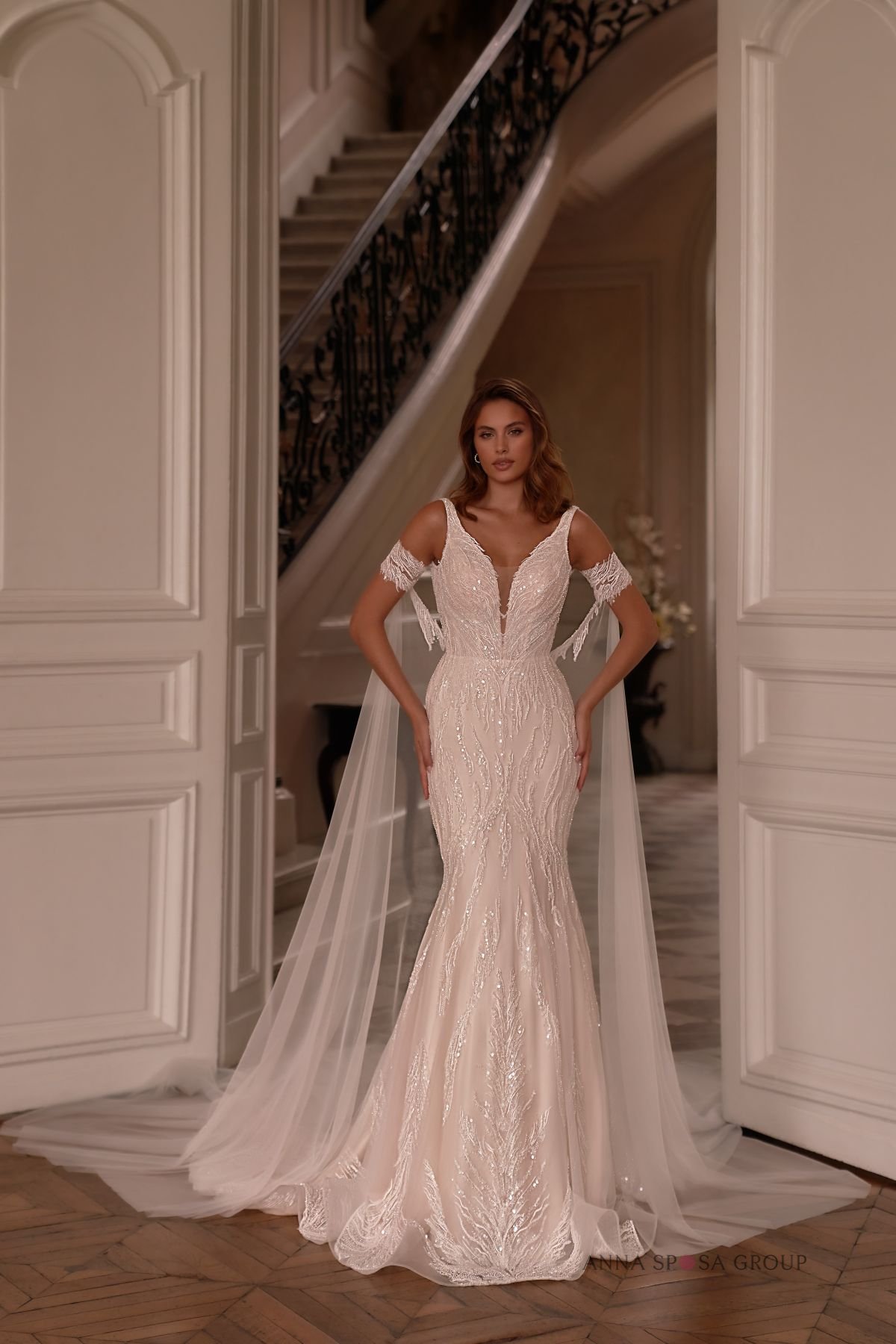 Accents: a spectacular fitted dress with wide straps. This luxurious dress is embroidered with lace, beads, sequins and has a seductive deep V-neckline. The open back adds a special zest to the look, while original detachable sleeves and a long train make it even more interesting.