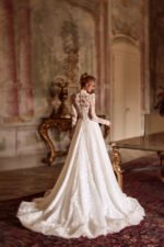 Accents: a romantic A-line gown with long sleeves. The dress is decorated with matte floral lace, while the bodice is made of semi-transparent mesh, adding a dramatic touch. Voluminous shoulders bring a special charm to the look;