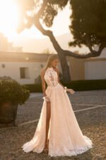 Accents: a romantic A-line gown with a halter neckline made of delicate matte lace. The open shoulders and back highlight the bride’s grace, while the high slit skirt adds a touch of gentle allure;